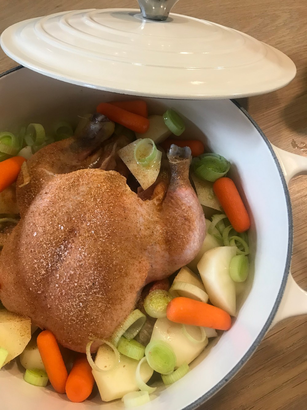 Slice the onion and, or leeks, into thick slices and lay them on the bottom of the pot with a few good lugs of olive oil. Place the chicken on top of the onion and season the chicken generously. Place this in the oven, warmed to 180*, and allow the chicken to brown and crisp up a bit. Maybe 20 minutes.