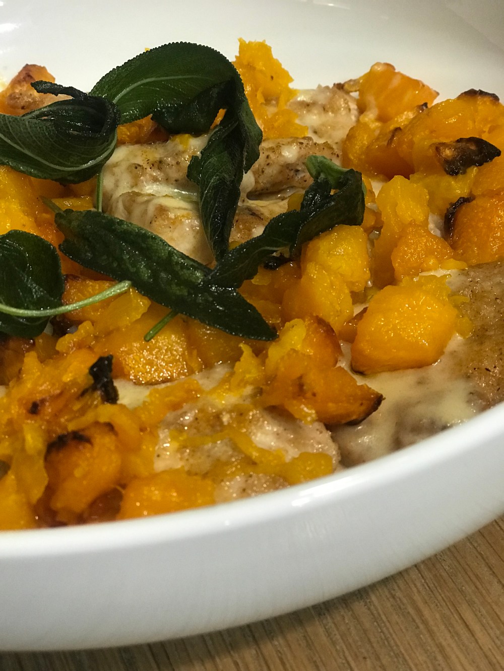 Return the chicken to the pan and turn off the heat. Top this with the roasted butternut and sage leaves, and serve it immediately straight out of the pan! This dish goes well with gnocchi or a side of couscous or just a simple salad.
