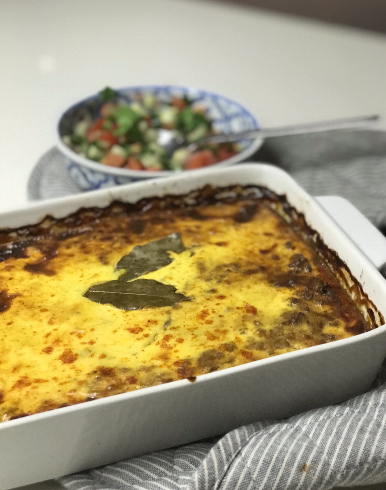 Once the mince is ready, remove it from the heat and gently mix the mashed bread into the meat. This will lighten the texture. Transfer this into a large, rectangular, greased oven dish. Spread the mixture out evenly using the back of a spoon. Insert the bay leaves, one on either side of the dish. This adds flavour during the baking process.