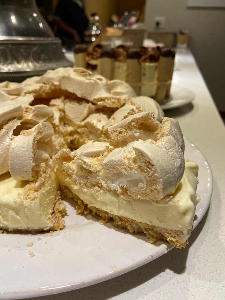 In the meantime, prepare the filling. Separate the eggs and mix the yolks with the condensed milk. Then add the lemon juice, stirring well to combine. Once the mixture has thickened, grate in the lemon rind. Finally stir in the cup of cream. It’s very important that you don’t stir in the cream until the lemon is well combined so that the cream does not curdle. Now pour this mixture into an ice-cream maker and churn according to the manufacturer’s instructions. If your ice-cream maker does what mine does, your ice-cream will still be quite soft. Scrape this out onto the base of your cake and place it in the freezer to harden. This will need another couple of hours to freeze properly.