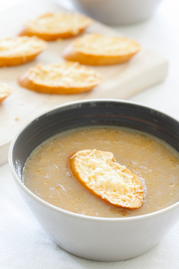 About 20 minutes before you’d like to serve the soup, preheat your grill and prepare the baguette. Slice the baguette diagonally to get nice long pieces, and then sprinkle the grated cheese on top of each one. Grill for 10 minutes or until the cheese has melted and turns golden brown.