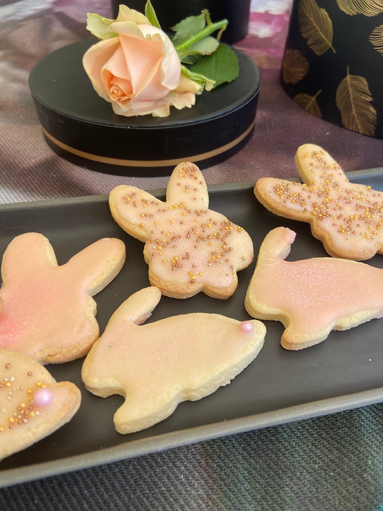 Roll out the dough on a floured surface to a thickness of approximately 4mm. Cut out your cookies using a cookie cutter – hopefully you can find a bunny shape for Easter – and set them slightly apart on a lined baking tray. Bake these for around 12 minutes until the cookies are golden brown but not too dark. To prevent further browning on the bottom carefully remove the cookies from the hot baking tray and allow them to cool on a wire rack. When they have reached room temperature, they are ready to ice. For the icing, combine all the ingredients and add only a drop of colouring at a time until the desired hue is achieved.