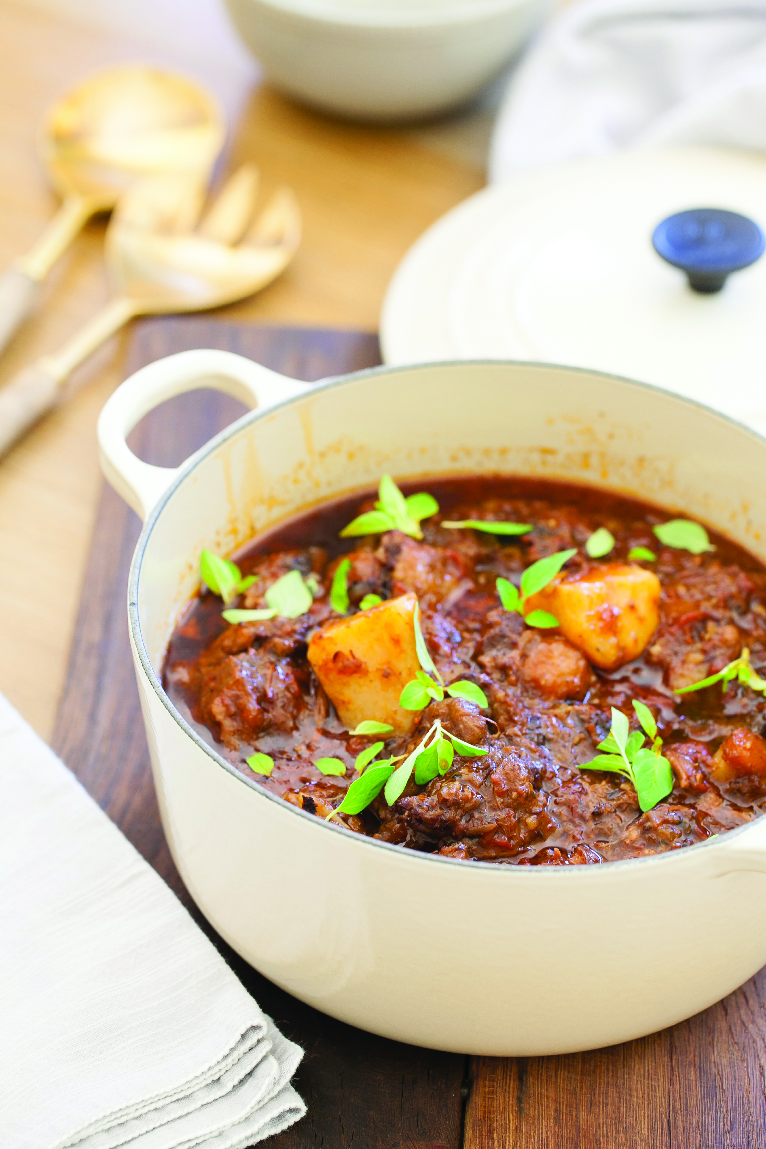 Pre-heat your oven to 160°C. In a heavy-based, oven-proof pot, fry the garlic and onions until soft and transparent. Add the oxtail and season it with the salt, spices and herbs and continue to brown it, adding the Worcestershire sauce and chutney. Add the flour ensuring the oxtail is evenly coated. (This will help thicken your stew). Add the tomato, chicken stock and red wine, ensuring that the liquid fully covers the meat and you have a good, saucy consistency. Place the lid on it and pop it into the oven for four to five hours.