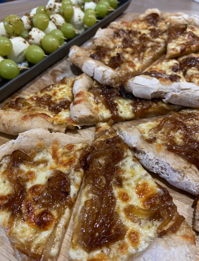 One of my favourite things to make is this caramelised onion flatbread. I choose to make it on the weekend because it does take a little time. It makes a great starter if you’re having guests, and is just perfect for this season of outdoor entertaining. Notice my absolute favourite Ottolenghi burrata and grape salad in the background – a delicious pairing in my opinion (hint hint, you can find that recipe if you Google it).