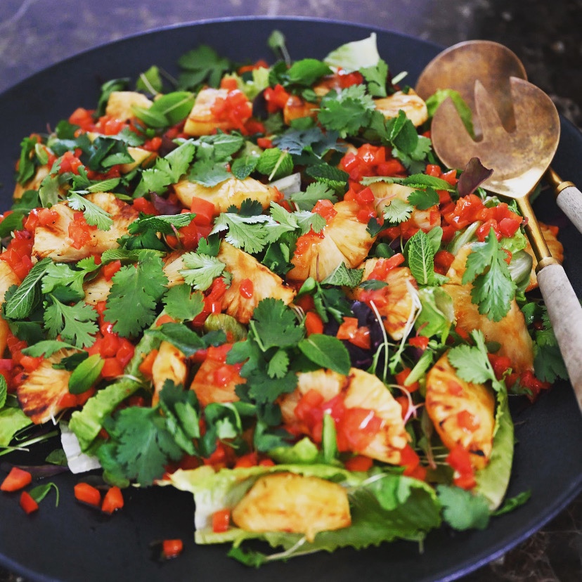 Finely chop the peppers and stir them into the sweet chilli sauce. To assemble the salad, scatter the pineapple and peppers over your greens, and shred fresh coriander and mint over the top – an absolute must for that burst of summertime flavour! Finally, drizzle with the dressing just before you serve.