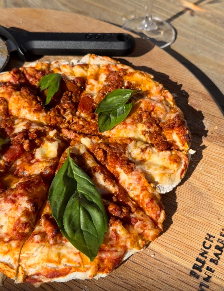 Top your pizza base with tomato sauce, grated mozzarella, followed by some salsiccia sauce and finish it off with a good glug of Banhoek chilli oil!