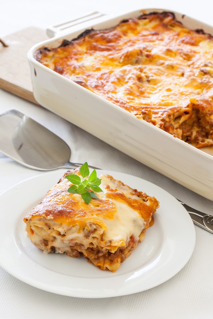 Preheat the oven to 180°C. Grease a large, rectangular oven dish and start layering the ingredients. Begin by laying the lasagne sheets side by side, making sure there are no gaps between them. You can even break the sheets into smaller bits if you have smaller gaps to fill. Spread a thin layer of bolognaise over the pasta, flattening it using the back of the spoon. Ladle the cheese sauce over the mince just enough to cover the meat. Place your next pasta layer, followed by the bolognaise and the cheese sauce, as before. And then repeat for a third time. On top of your final layer of cheese sauce, sprinkle the two cups of cheddar cheese. This will form a delicious cheesy crust.